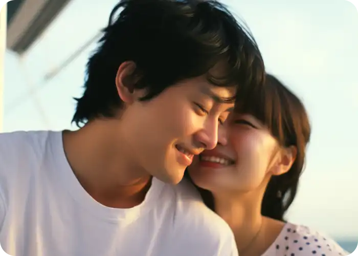 彼の誠実さに心を打たれ、初対面の日に運命を感じました。今では幸せな結婚生活を送っています。